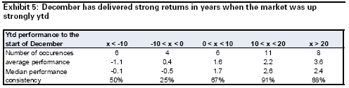 Recently, there has been a lot of talk in the investor community about de-risking and investors locking in their performance for the year. This has resulted in more bearishness going into the year end, as many have questioned the potential for further market upside based on the sustainability of the economic recovery. A seasonal analysis conditional on year-to-date performance tells a very different story. The better the performance has been from January to November, the more positive the return has tended to be in December (Exhibit 5).