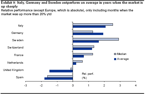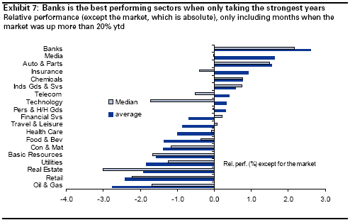 Commodity related sectors exhibit the lowest relative returns among all sectors in December. This holds even when restricting the sample to years when the market went up by more than 20% in the run-up to December. Conversely, Financials and selected Cyclicals have been the best performing sectors in December when the market has risen by more than 20% in the first 11 months. Looking at countries, the results are less interesting as the differentiation is less marked than between sectors. Germany stands out as the best performing country on average in