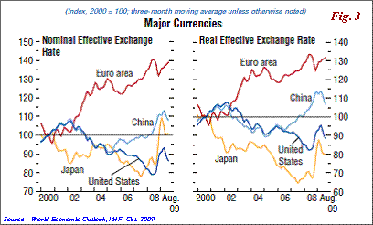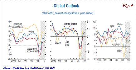 The IMF expects Asia’s GDP growth, driven mostly by Chindia, to be 5.75% next year—almost double the 3% rate forecast for the global economy. Specifically, the IMF projects China annual growth to be 8.5% and 9% for 2009 and 2010 respectively. In contrast, advanced economies annual growth in 2010 is projected to be about 1.25%, following a contraction of 3.5% in 2009. (Fig. 4, click to enlarge)