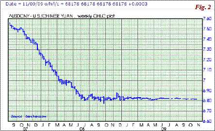 Beijing has kept the Yuan pegged at about 6.83 per dollar since July 2008, seeking to help manufacturers battered by the collapse in demand abroad. The Yuan advanced 21% in three years from July 2005. (Fig. 2 & 3, click to enlarge)